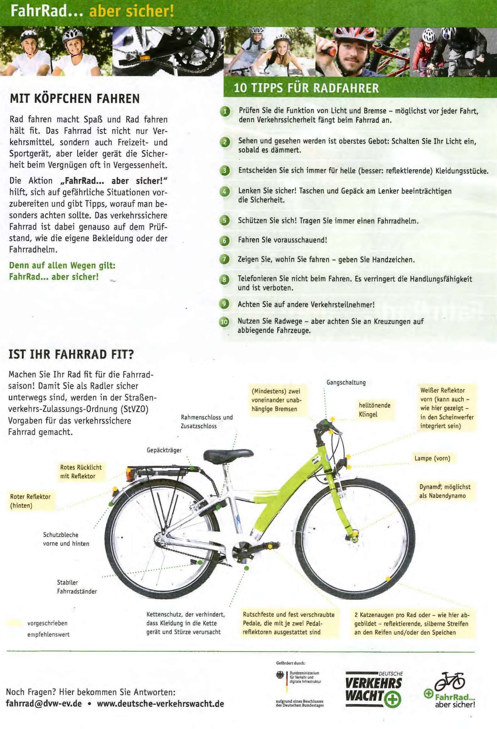 Bei öffentlichen Veranstaltungen gibt es am Infostand den aktuellen Flyer zum Thema „FahrRad… aber sicher!“ aus dem Bundesprogramm, der wertvolle Tipps im Umgang mit dem Rad gibt. Weitere Broschüren zum Thema Fahrrad sind bei der Verkehrswacht erhältlich..